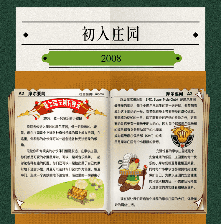 在这一年,,摩尔庄园诞生了。。。。在这里,,大家都是可爱的红鼻子鼹鼠小摩尔,,,可以一起勤劳耕作,,一起高山滑雪......我们都是摩尔庄园的建设者。。。