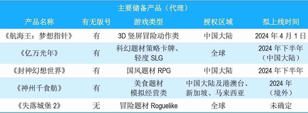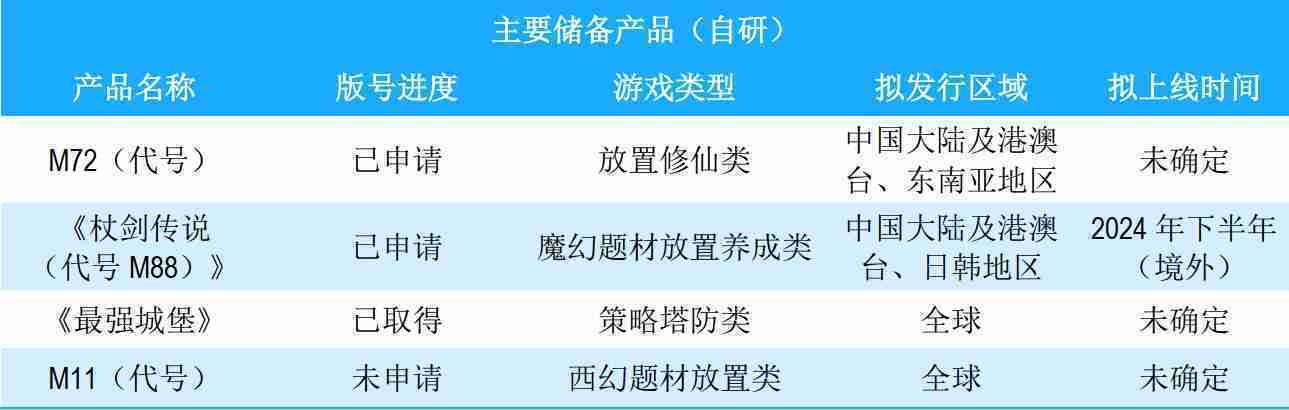 公司储备的多个自研、、、、代理产品都在有序推进当中,,涵盖放置类、、策略类、、模拟经营类、、RPG、、Roguelike等多元化游戏品类,,,,储备的主要自研和代理产品如下::::