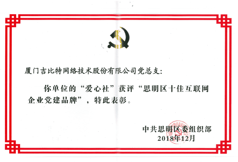 经初审评选、、、网络评选和专家评审等环节,,,,"厦门赏金大对决网络技术股份有限公司党总支-爱心社" 从全区28个参评党建品牌中脱颖而出,,,获评"思明区十佳互联网企业党建品牌"。。。